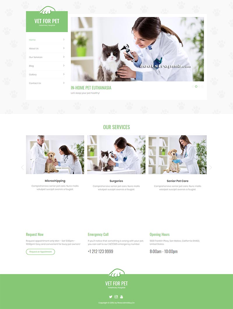 利用Bootstrap框架创建的响应式的宠物医院网站HTML5模板,适用于任何类型的兽医、健康、医疗、宠物,动物医生,宠物医院和更多。这个宠物医院HTML模板创建使用HTML5,CSS3,jQuery,Bootstrap4,它看起来完美的桌面,平板电脑和移动设备。