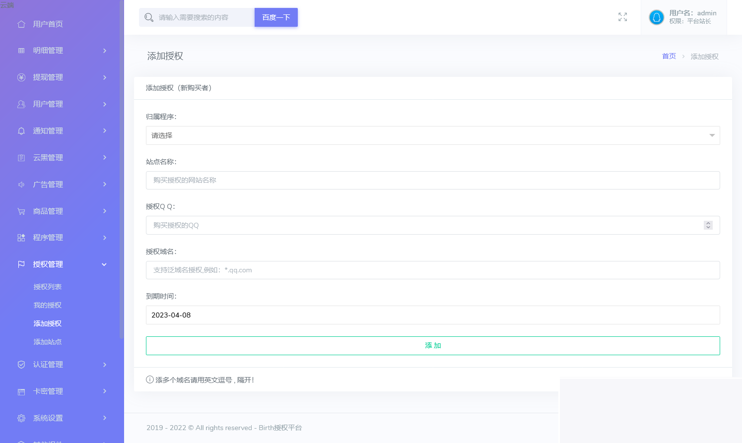栀子花授权系统(Birth授权系统重铸版),本系统支持泛域名授权,单域名授权,多程序授权,在线更新,盗版入库,API对接,检测授权,站点记录,卡密系统,代理系统等多种主流/小众功能,以信誉求市场,以稳定求发展,行业内最安全,简单易用,专业的技术团队,最放心的PHP授权系统。