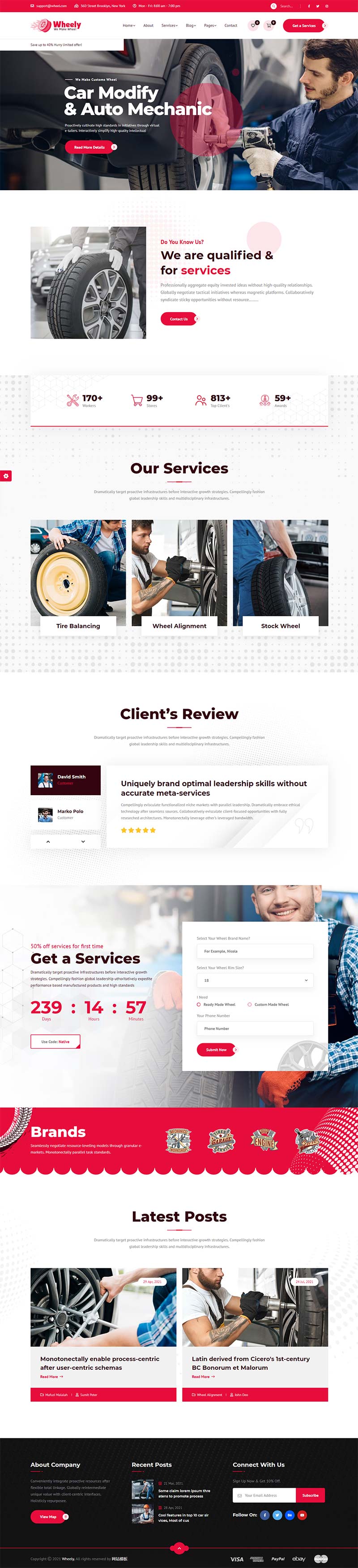一款红色多用途的品牌轮胎和维修公司网站响应式模板。适用于:如汽车,自行车/摩托车,自行车轮胎公司网站。
