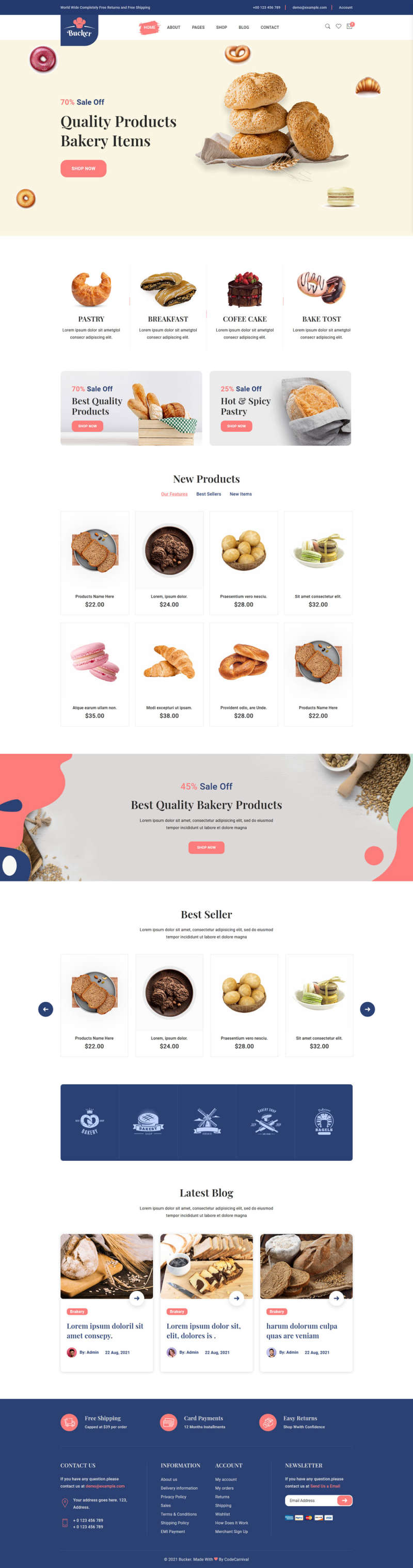 一个基于Bootstrap5框架构建,响应式的甜品面包店铺销售网站模板。适合饼干和面包店,星巴克的电商模板。包含2个主页,总共16个页面