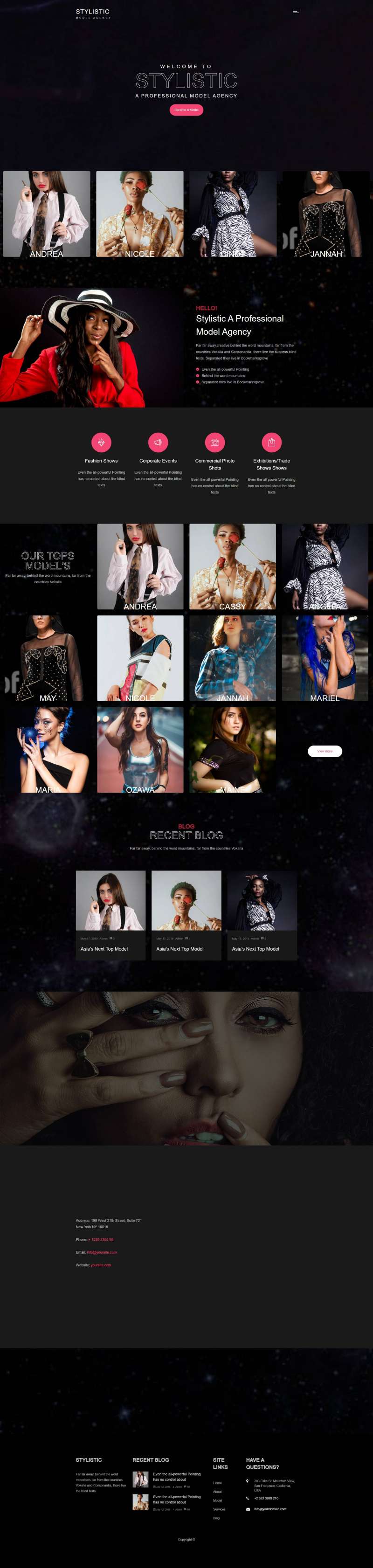 一款高级大气有全屏背景的Bootstrap4模特经纪公司网站模板,它简单,干净,易于编辑,可适用于模特经纪公司,模特展示,模特学校、时尚杂志等网站。