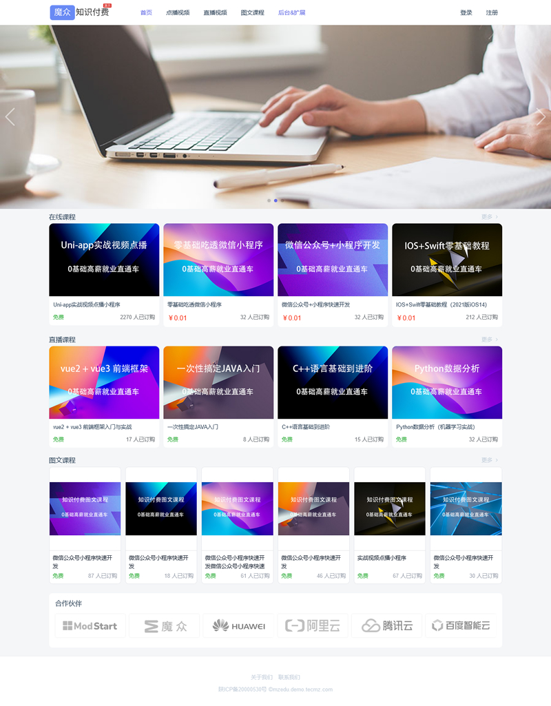 魔众知识付费系统是基于Laravel开发的在线教育点播收费系统,让您一键开展线上教育业务,支持视频点播,电子书,图文收费,考试系统,问答等功能。