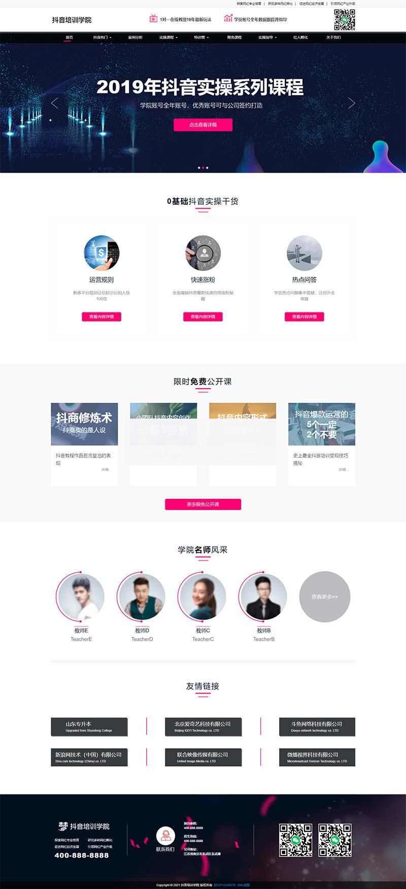 本套织梦模板采用织梦5.7内核开发的模板,这款模板使用范围广,不仅仅局限于一类型的企业,抖音培训机构、网红培训类的网站都可以用该模板。你只需要把图片和文章内容换成你的即可,颜色都可以修改,改完让你耳目一新的感觉!布局规整,利于用户体验,手工书写DIV+CSS,代码精简。