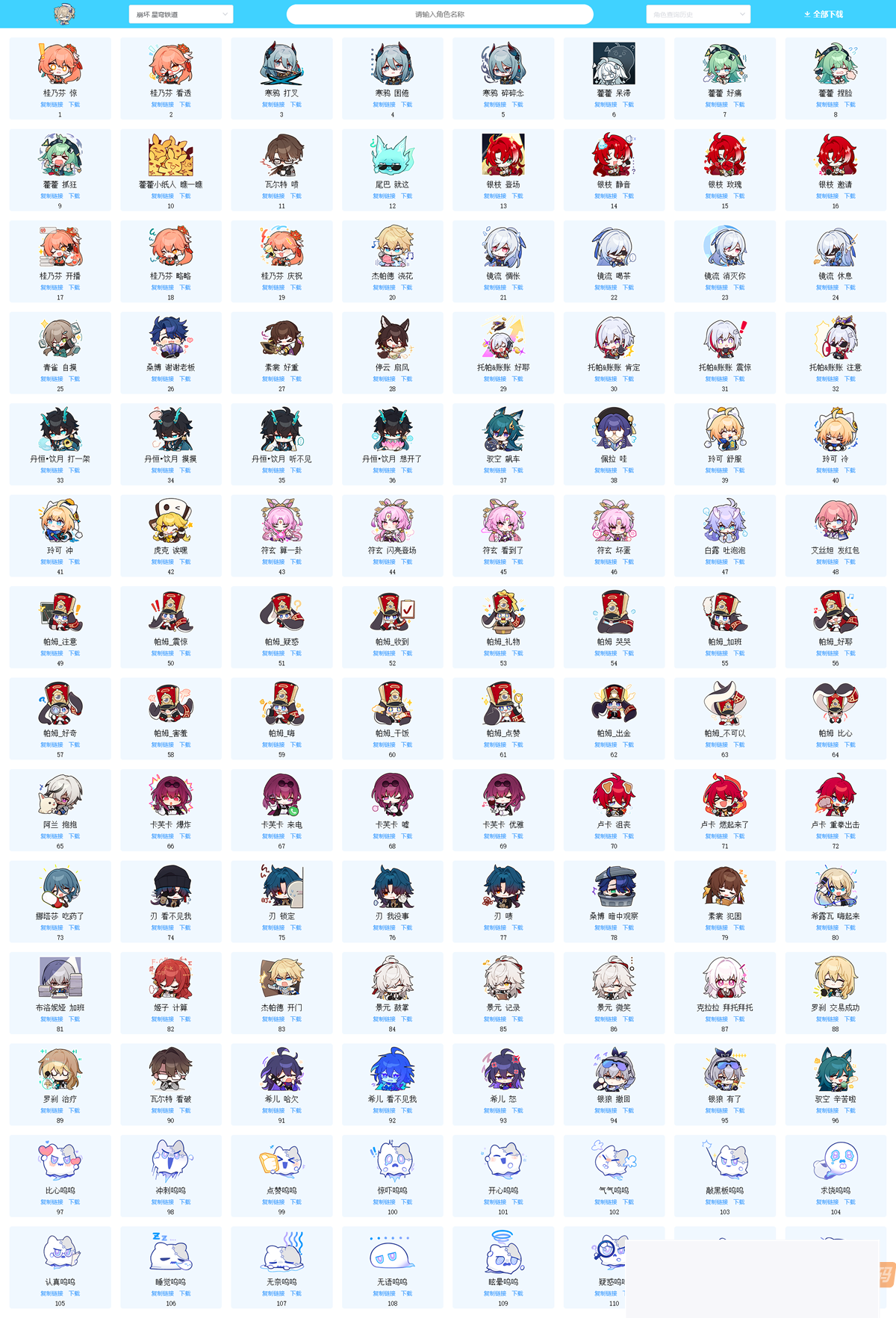 米游社表情包整合网站源码,来自Github大佬的项目,包含米游兔123枚,米游社 玩家12枚,崩坏 星穹铁道112枚,绝区零218枚,NAP32枚,崩坏RPG62枚,崩坏3-1282枚,原神 V官方663枚,未定 官方199枚,原神 V玩家35枚,崩坏3-2146枚,崩坏2 玩家31枚,崩坏学园2,支持复制表情包链接或保存。