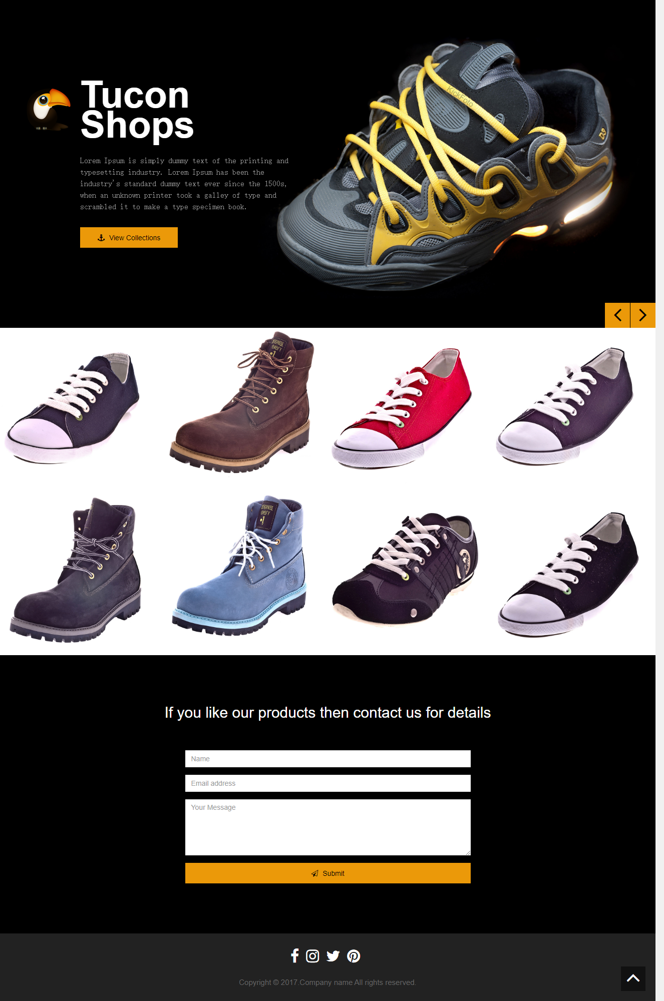 HTML5响应式运动鞋电商网页模板,自适应分辨率,兼容PC端和移动端,有商品展示、订单提交等功能单页模板。 声明:本站所有文章,如无特殊说明或标注,均为本站原创发布。任何个人或组织,在未征得本站同意时,禁止复制、盗用、采集、发布本站内容到任何网站、书籍等各类媒体平台。如若本站内容侵犯了原著者的合法权益,可联系我们进行处理。