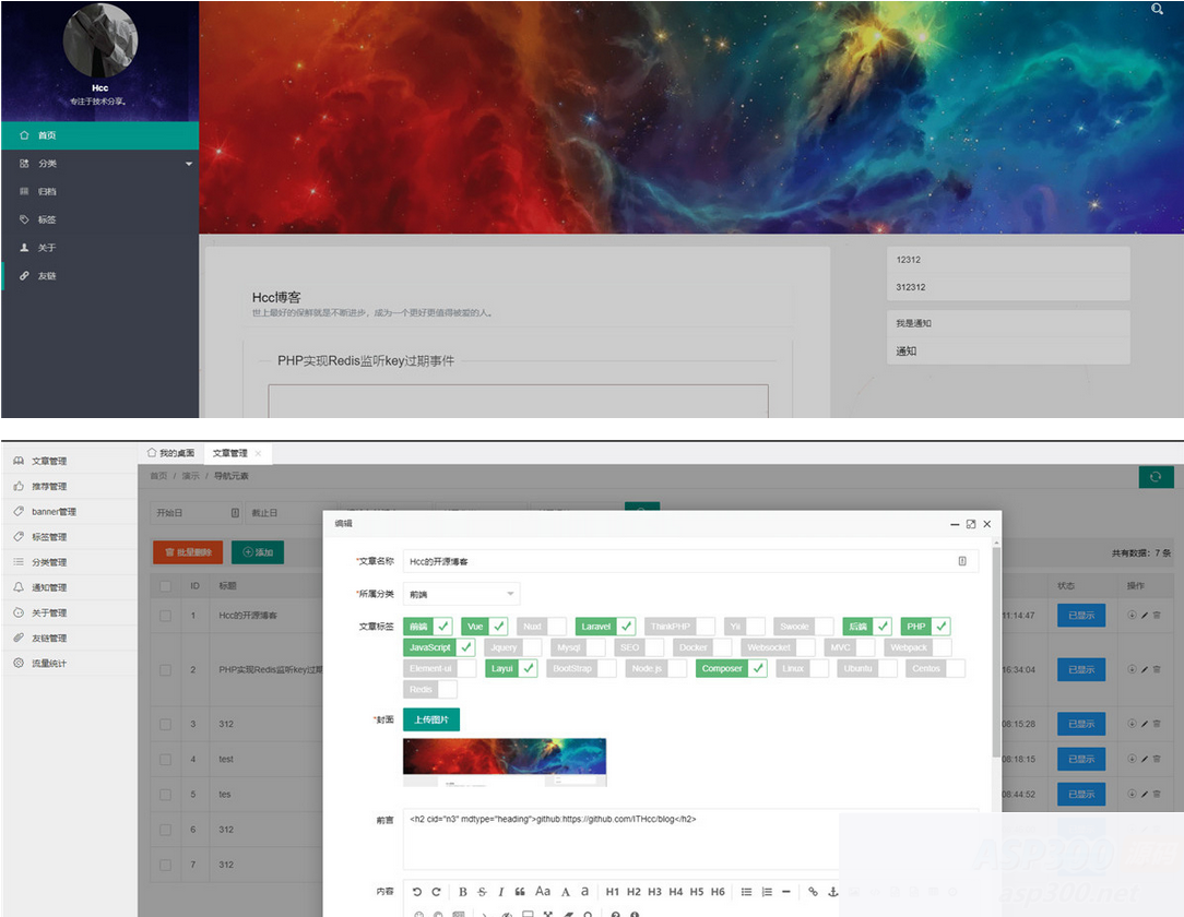 后台使用Laravel5.7框架开发,web路由提供后台管理,api路由提供API接口。用的X-admin后台模板。图片用AliyunOss对象存储,通过redis中的订阅者模式监听key失效事件,来删除 AJAX上传文件后未提交表单造成大量无主文件。使用editor.md富文本编辑器以markdown语法编辑文章,自动生成html代码。