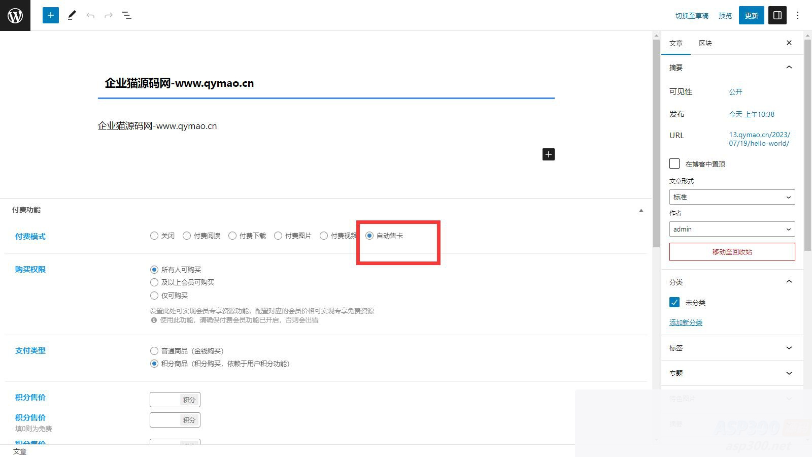 后台新建新文章,然后选择自动售卡