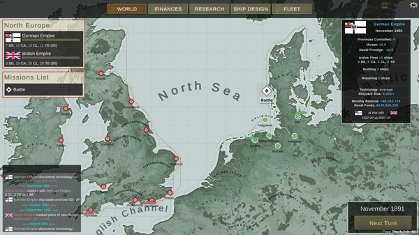终极提督:无畏战舰旨在成为第一款提供逼真的战舰设计与战斗的海战题材模拟策略游戏,设计军舰,指挥舰队,为您的国家赢得海军军事竞赛。 建造你希望中的战舰 成为强大军舰的设计师,从小型鱼雷艇到强大的战舰,重现诸如无畏号战列舰等知名军舰以及实现数之不尽的独特设计。选择炮塔布局、装甲方案、烟囱位置、舰塔的多样性,使每艘船的外观和感觉都独一无二。军舰的每个设计细节都会直接影响其性能,它们的船体特征、内部升级选择和重量分布不仅会改变其速度和机动性,还会改变它们的武器效力。 强劲的AI AI根据“免疫区”的原理评估最佳的啮合距离,通过比较自己的火力和您的军舰,AI会明智地使用弹药,或者选择停火,或者根据目标的装甲防护类型切换不同的炮弹。在遭受严重破坏或者比您的舰队弱得多的时候,除非有特殊的任务指令,否则AI不会进行自杀式的举动而会选择撤退。 海军学院 在学院中测试您的船舶设计和战术技能。 “海军学院”包括22种以上的战斗场景,您必须设计一艘船或一个中队来完成某些战术战斗任务。范围从摧毁发动机损坏无法动弹的舰船到与数量相差悬殊的敌人战斗。这些任务将使您在我们开发战役的时候,可以练习并享受游戏中许多创新的设计和战斗方面的乐趣。