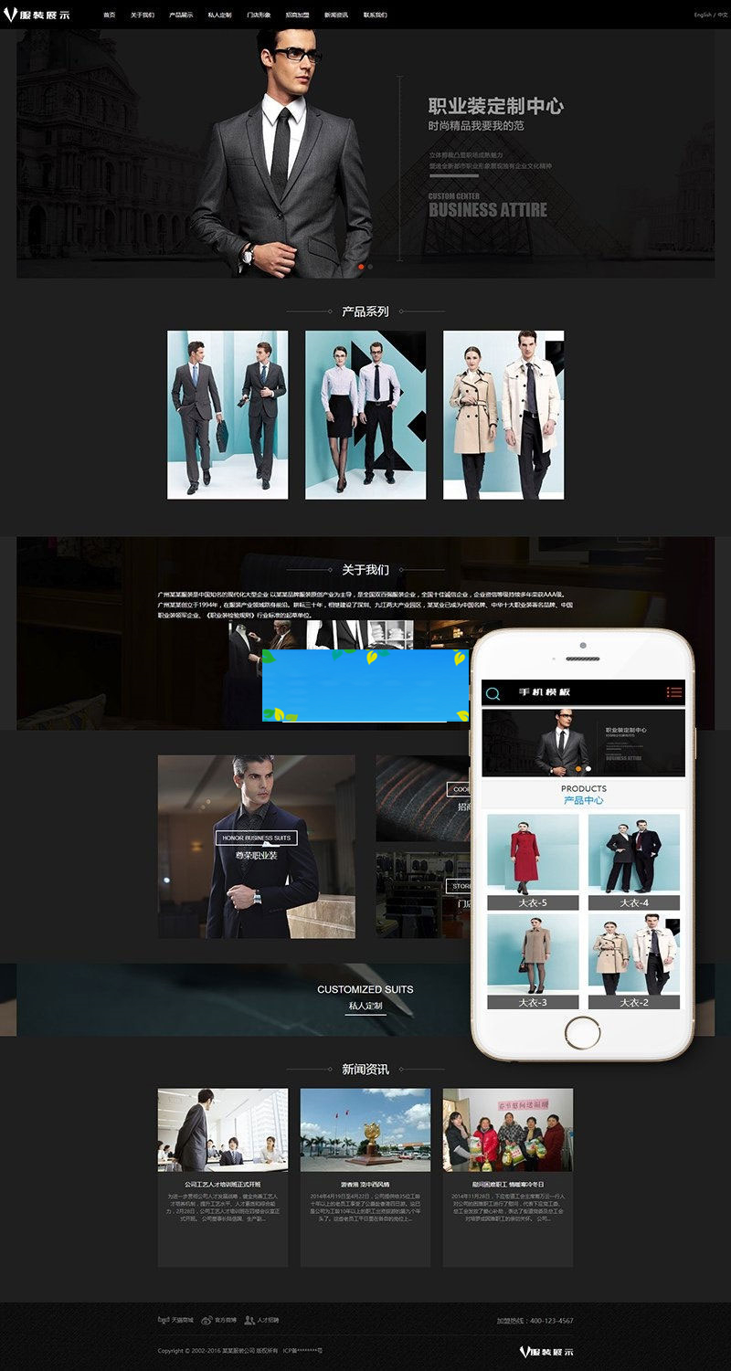 织梦最新内核开发的模板,该模板属于中英双语、服装、职业装定制、礼服类企业使用,一款适用性很强的模板,基本可以适合各行业的企业网站!