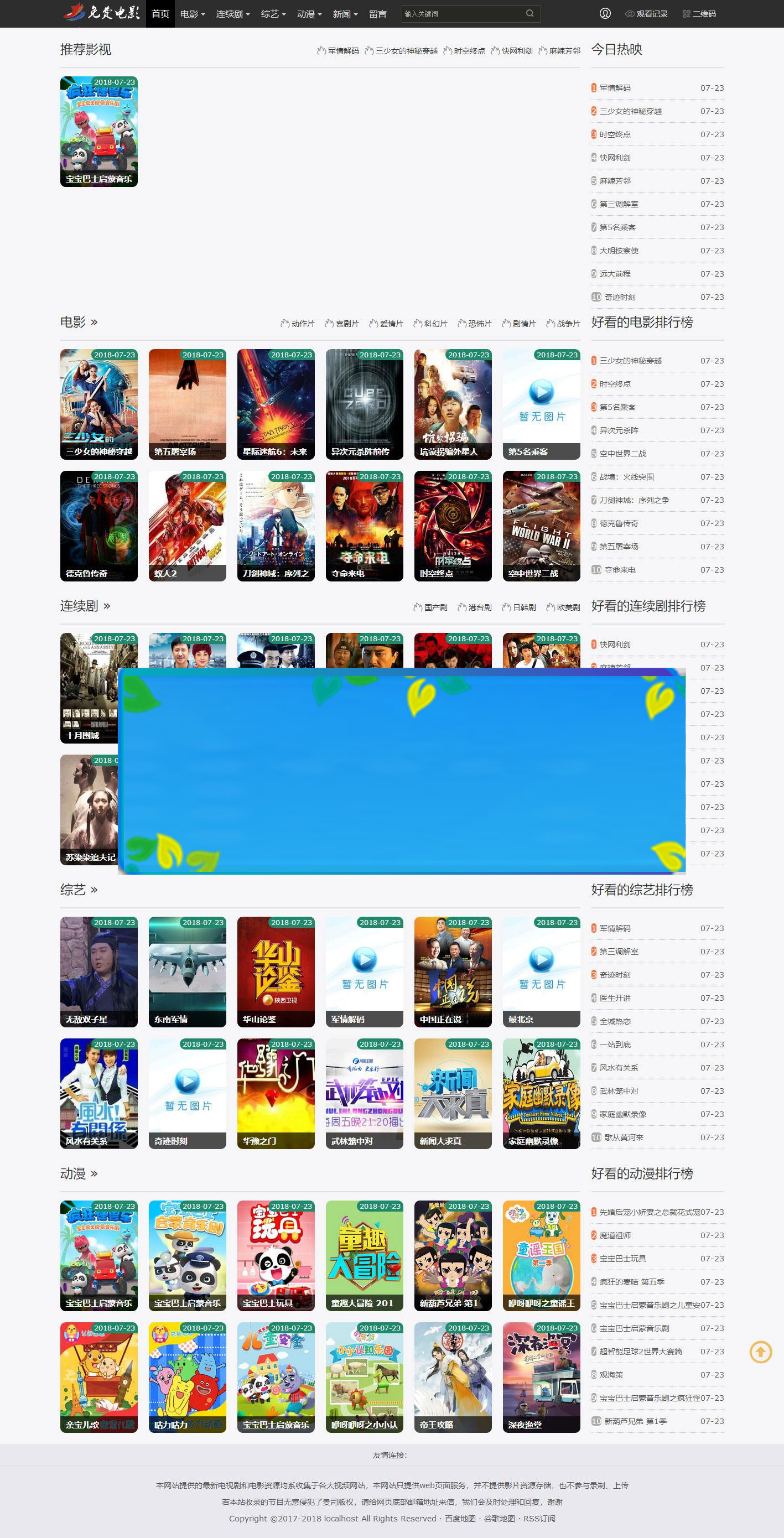 源码介绍 上传模板至template目录下,后台→系统→网站参数配置 选择模板 首页幻灯片请后台设置9星推荐与海报图片 查看更多苹果CMS模板 声明:本站所有文章,如无特殊说明或标注,均为本站原创发布。任何个人或组织,在未征得本站同意时,禁止复制、盗用、采集、发布本站内容到任何网站、书籍等各类媒体平台。如若本站内容侵犯了原著者的合法权益,可联系我们进行处理。