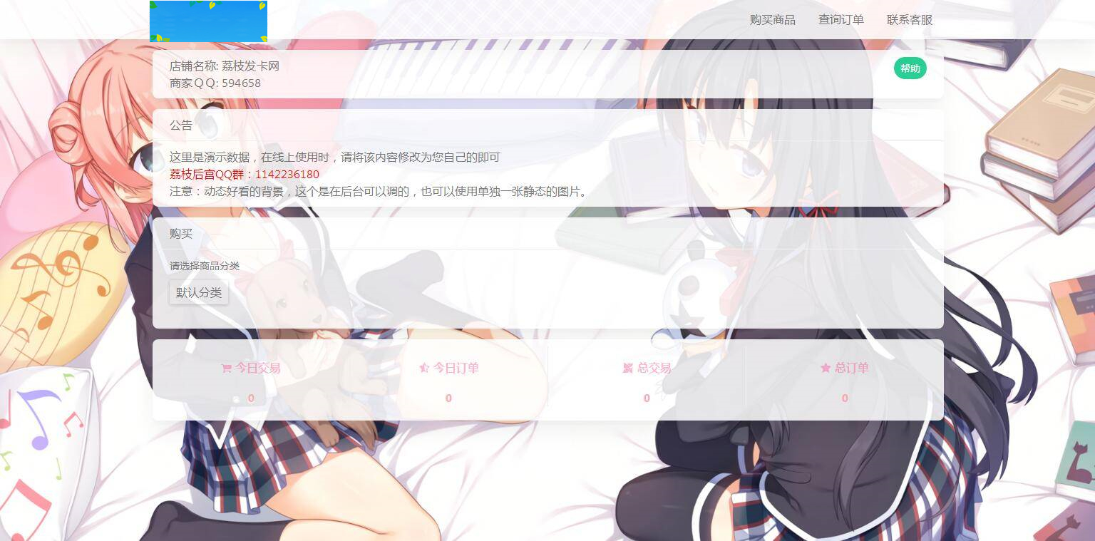 云更新,为了去掉繁琐的后续版本更新又要下载又要升级数据库等等琐事,所以本程序实现了自动更新,一旦出现新版本, 后台只需要点击按钮即可自动完成程序的所有无缝升级。 基础功能,卡密销售,后台添加商品,然后导入卡密,进行售卡。 批发优惠功能,商品中可开启批发优惠功能,以及编写优惠规则,客户一次性购买达到规定数量则会进行优惠。 支付对接,为了满足所有人的需求,让用户自己对接支付平台是不现实的,所以支付对接请交给作者,如果你想接入其他支付平台, 你只需要将需求提交给作者,作者会在2小时内完成对接,届时,你只需要在后台添加新的支付方式就可以立即使用。 界面优化,完美支持PC和手机,真正的内外二次元文化。