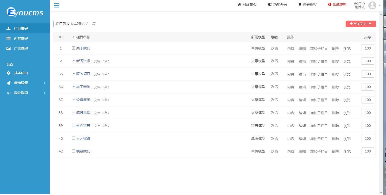 EyouCMS 用起来比dedecms 要方便很多后台设置一目了然 没有太多繁琐的设置