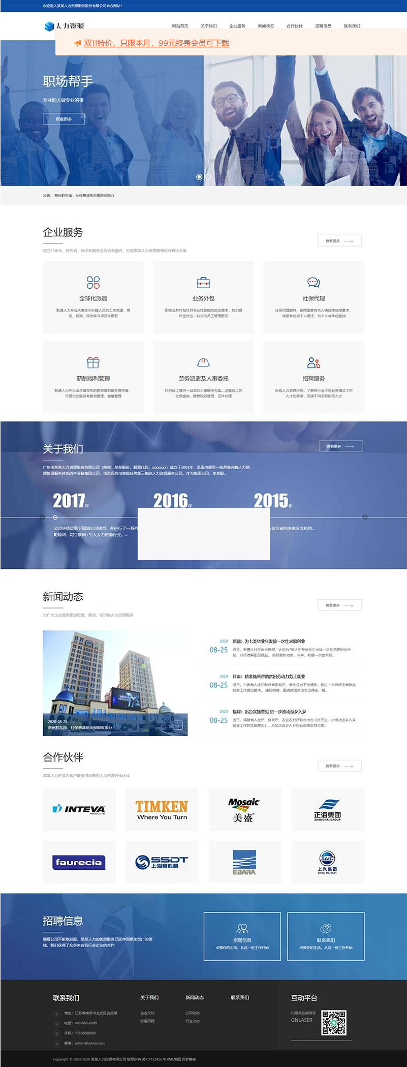 PbootCMS内核开发的网站模板,该模板适用于人力资源、企业管理网站等企业,当然其他行业也可以做,只需要把文字图片换成其他行业的即可;