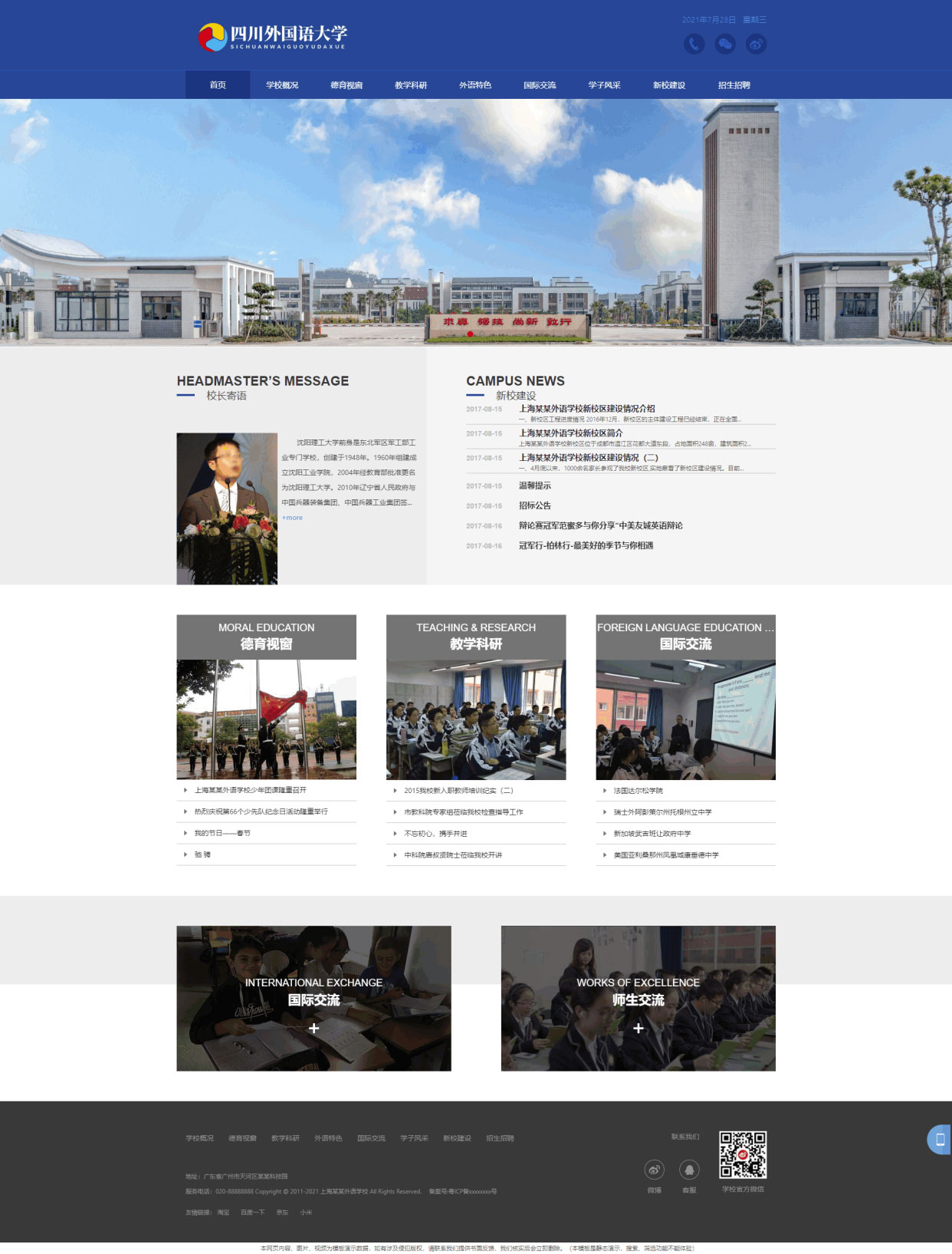 ThinkPHP5蓝色简洁响应式外国语大学学校学院教育网站源码 自适应手机端 声明:本站所有文章,如无特殊说明或标注,均为本站原创发布。任何个人或组织,在未征得本站同意时,禁止复制、盗用、采集、发布本站内容到任何网站、书籍等各类媒体平台。如若本站内容侵犯了原著者的合法权益,可联系我们进行处理。