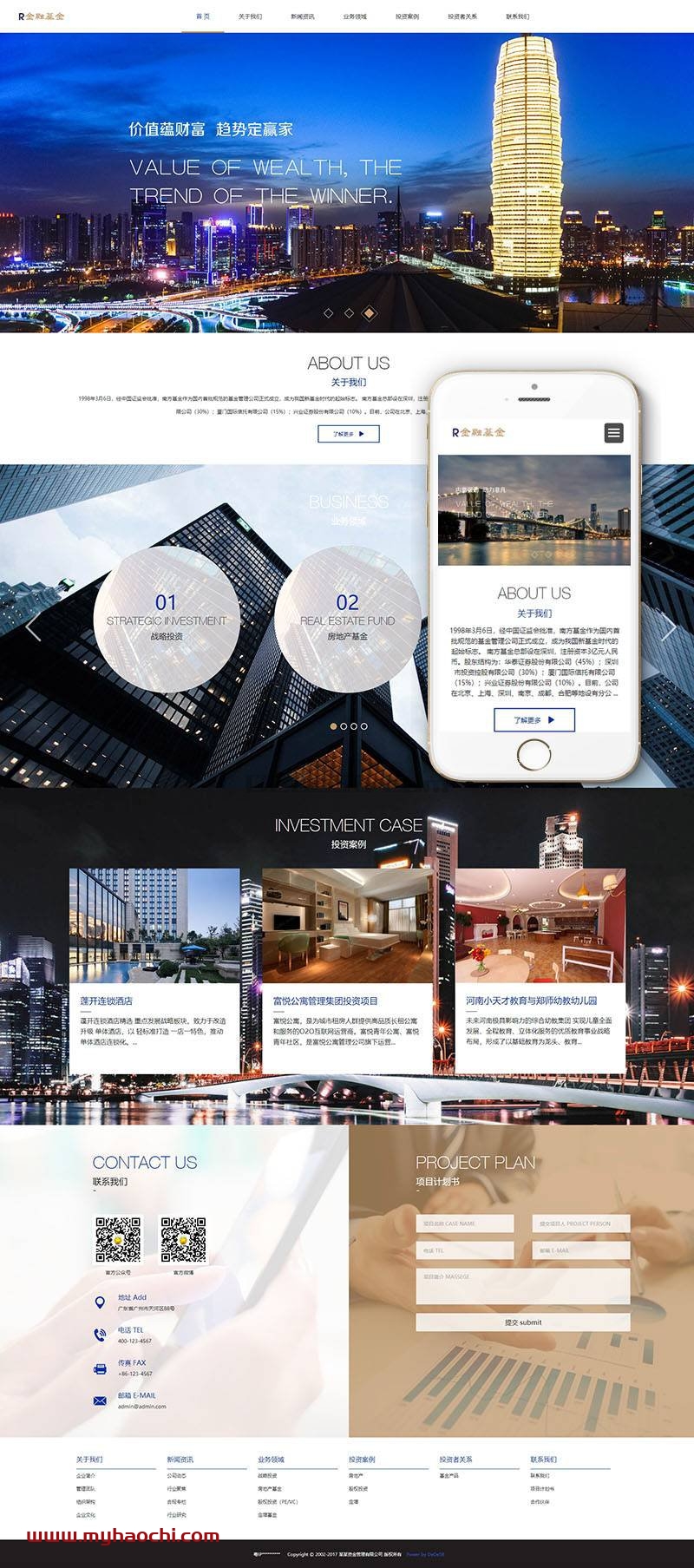 织梦最新内核开发的模板,该模板属于企业通用、HTML5响应式、金融投资、基金服务类企业使用,一款适用性很强的模板,基本可以适合各行业的企业网站!