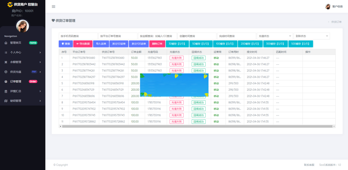 ⑤、有独立的商户后台和供应商后台可供供应商或商户查询订单以及官网订单号使用