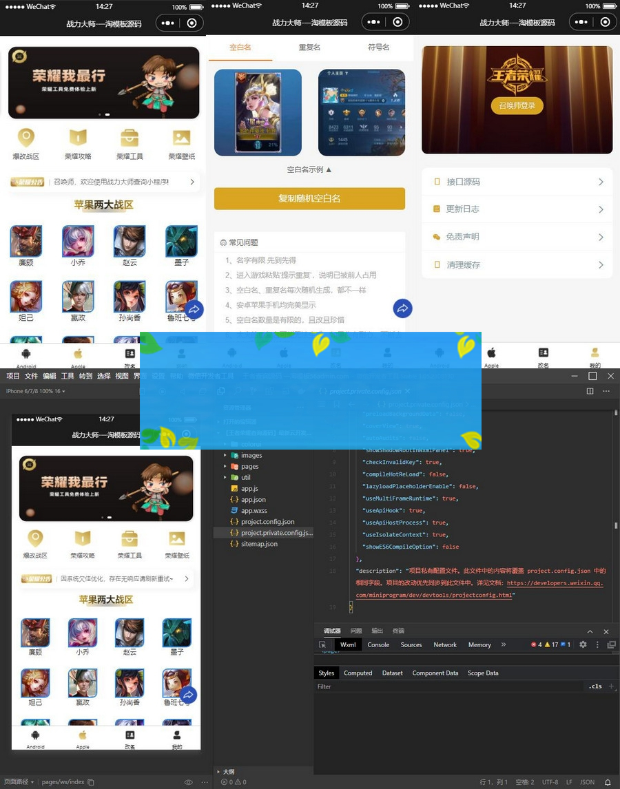 小程序介绍: 最新云开发微信小程序王者查询源码 带流量主 无需服务器、无需域名、注册一个小程序即可。 声明:本站所有文章,如无特殊说明或标注,均为本站原创发布。任何个人或组织,在未征得本站同意时,禁止复制、盗用、采集、发布本站内容到任何网站、书籍等各类媒体平台。如若本站内容侵犯了原著者的合法权益,可联系我们进行处理。